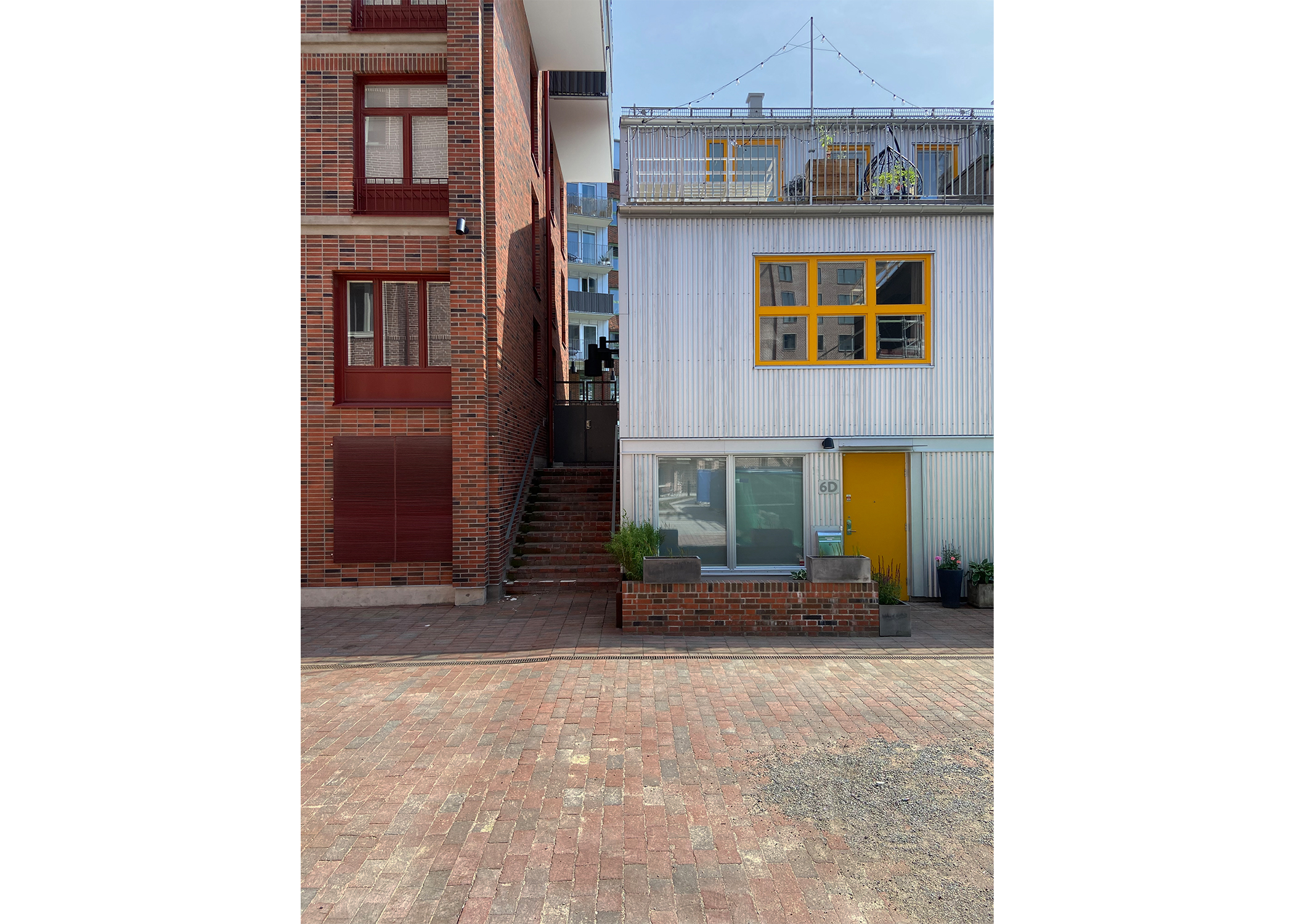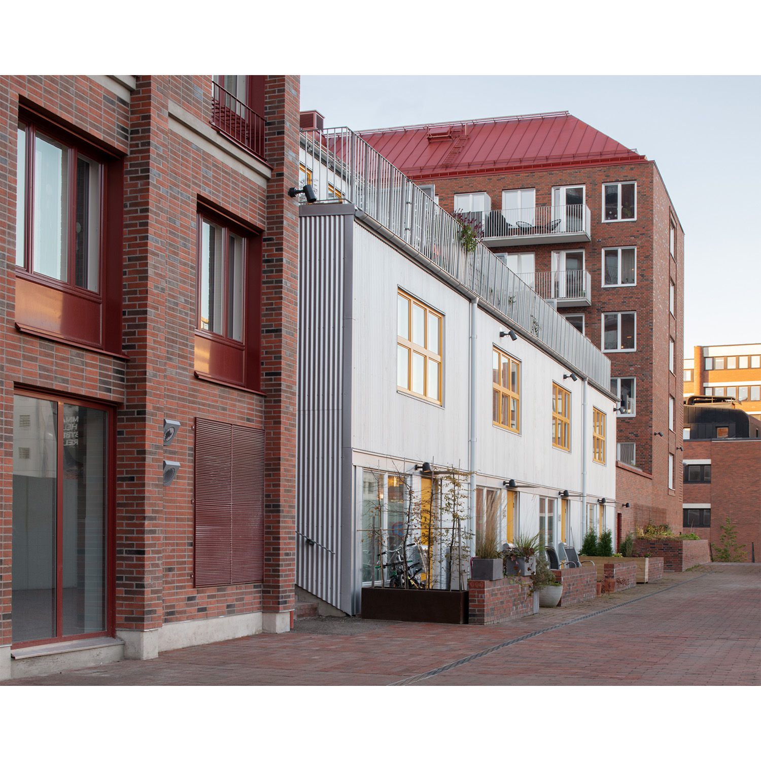 Fasadmaterialen tegel och stålplåt knyter an till omgivande bebyggelse och historia. Med undantag för en avvikande sockelvåning har samma tegelsten använts i alla hus - en för projektet specialframtagen sten. Identitet och variation har skapats med olika murningstekniker och detaljer som resulterat i en rik men ändå sammanhållen helhet.